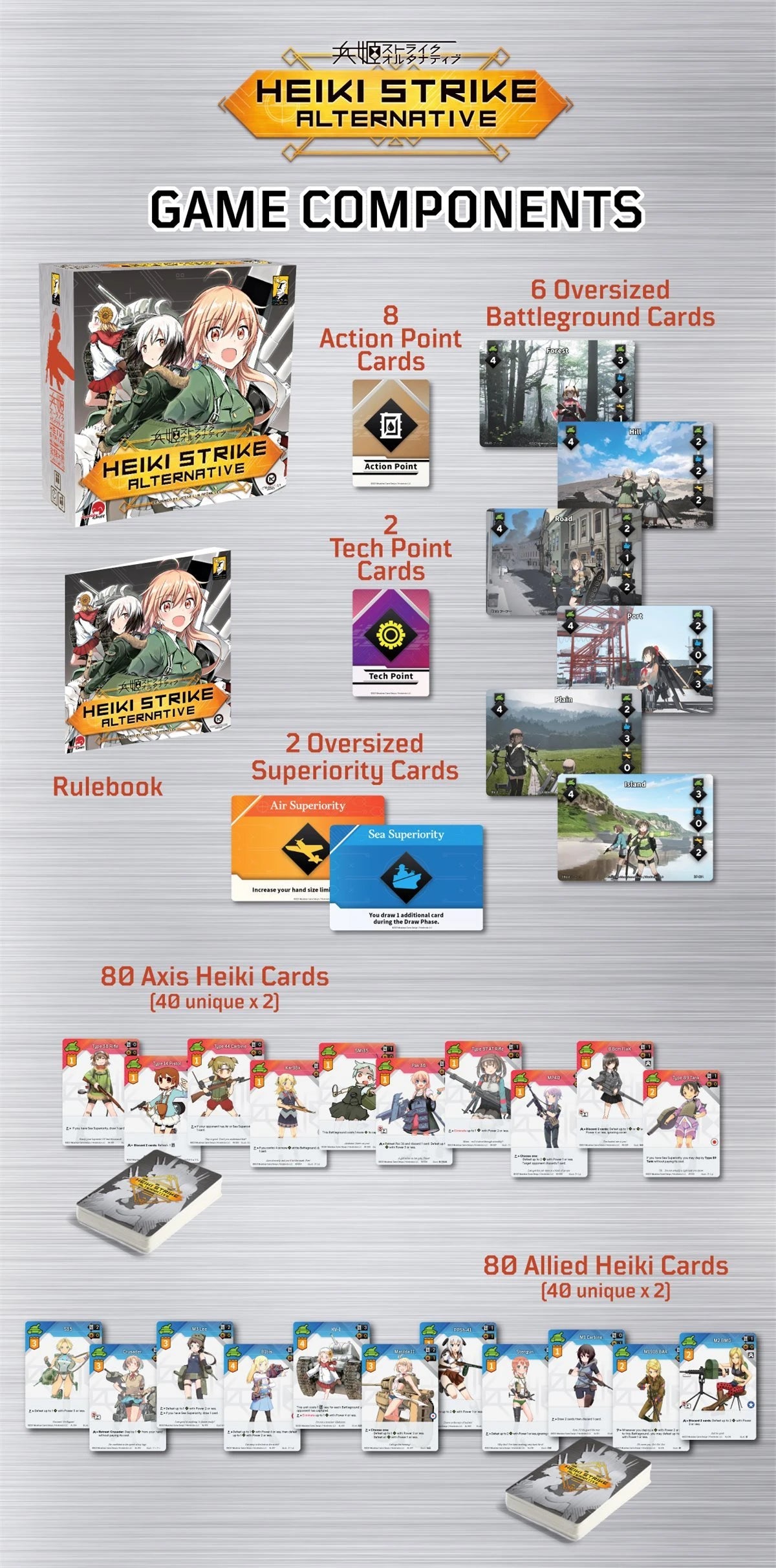 In Heiki Strike Alternative (兵姫ストライク オルタナティブ), the two players each build their own deck from the cards in the box, then deploy their princesses and anthropomorphized weapons to sea and air spaces in a fight to occupy the battlefields. To do this, a player must meet the "occupation conditions" for a battlefield, after which they take the battlefield card. Whoever claims three battlefield cards first wins.