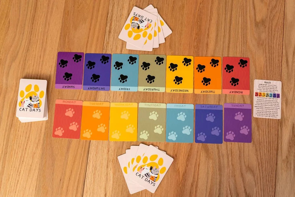 Fill your week of cats, scoring the most points in the process. Each cat has unique rules of play, some cancel scores, some swap cats, other special cards affect game play like the cat tree enabling multiple cats to score the same day and the cardboard box that steals a cat to your week.